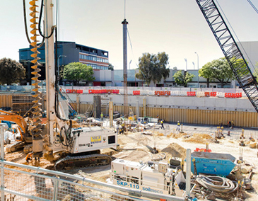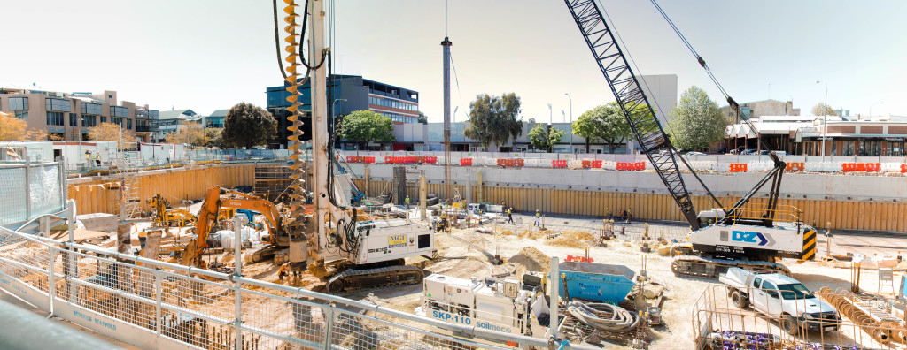 The 500 Hay Project is the largest top-down construction project undertaken in WA to date. This major mixed-use development includes 7 levels of offices, 9 levels of hotel accommodation and a cinema complex located over a 3 level basement car park. Introduction of top-down construction methodology which was adopted in conjunction with the erection of a steel framed structure as an alternative to instituting post-tensioned concrete. Heavy steel sections (plunge columns) were installed in the foundation piles to very low tolerance specifications, requiring specialist guides and positional techniques.